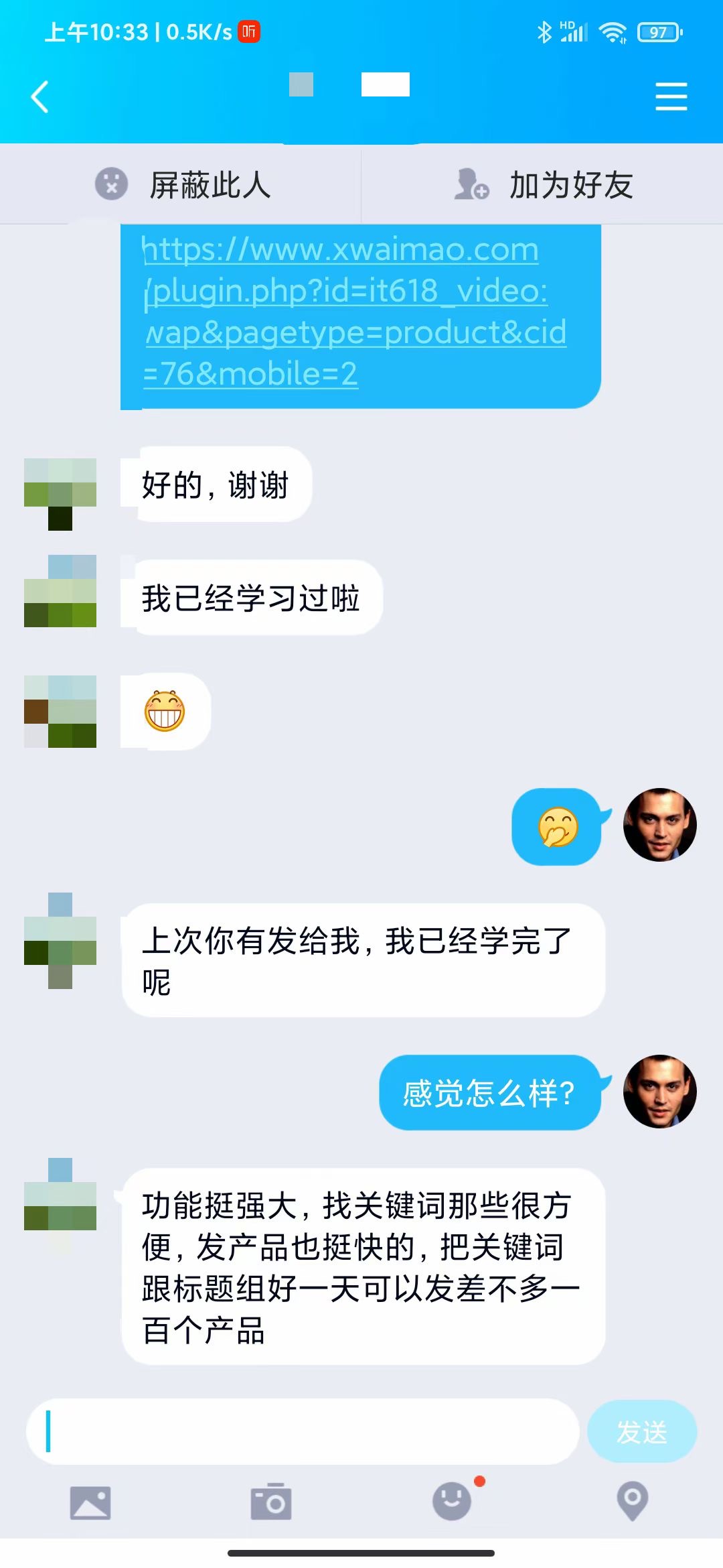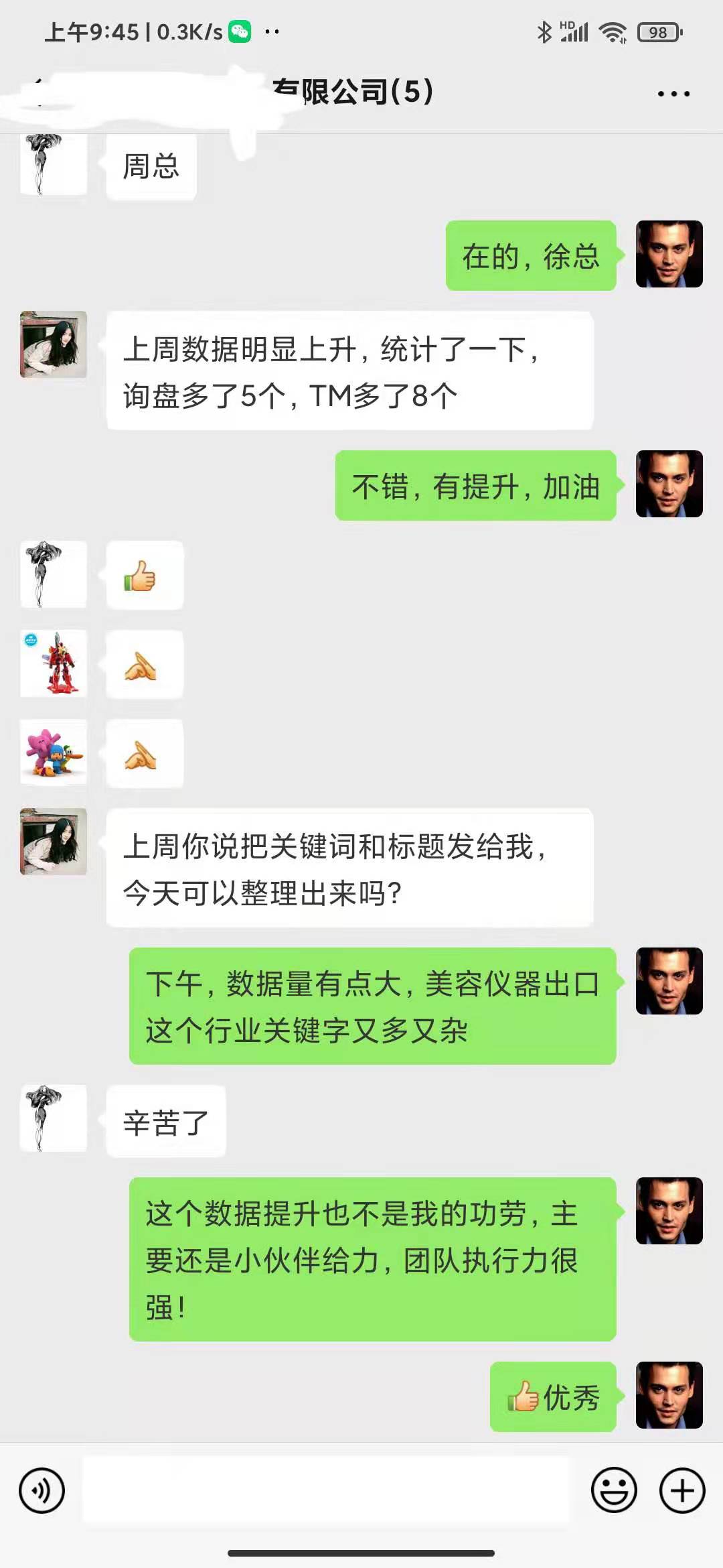 客户评价来听听阿里国际站大牛和一部分瑜歌老客户的评论在阿里巴巴国际站软件这个细分领域,阿里瑜歌助手无疑是你的一个宝藏软件 关键词 阿里瑜歌助手值得购买吗? 阿里瑜歌助手软件靠谱吗? 阿里瑜歌助手软件好用吗? 阿里瑜歌助手有人用过吗? 瑜歌助手对国际站有效果吗? 阿里瑜歌助手有人用过吗? 阿里瑜歌助手稳定吗? 我是谁?我是Jack,阿里瑜歌助手的创始人。我前后就职3家公司,第一家公司主要是做软件开发的,2010后入职两家都是外贸公司,我花了很多时间在阿里国际站运营上,从2012年第一版阿里国际站助手,发现这个领域居然没有可用的软件。索性就和朋友们一起做了一个,一开始只是自己用。从2013年左右开始对外出售,我们的客户也越来越多,不知不觉到现在已经10年了,我会继续努力改进和更新软件的! 我们的愿景在从事外贸这10年里,我们也走过很多弯路。2014年的时候,我们决定只专注于国际站外贸服务和软件领域(当然了,我们每年也会接一些店铺做,毕竟在做店的过程中也会有新的思路,对软件新功能开发也是一件好事)从2018年左右开始越来越多人进入外贸这个行业,相对应我们的客户也越来越多,责任也越大。我们的愿景是:让天下没有难做的国际站! “很难得在外贸领域有一款专门针对阿里国际站的软件“ —— 邦阅网 PS:为了保护客户隐私,下面微信或者QQ聊天截图,部分客户头像、姓名、店铺链接等敏感信息做了马赛克处理。 点击加载更多 评论对我来说非常重要!如果你也想为阿里瑜歌助手写下你的好评,我们会非常开心的,我收到后会发布在这个页面,请加我的微信:Jackz1009 或者扫描二维码添加好友,非常感谢你的支持! 感谢一路上有你